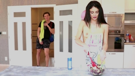 Восемнадцатилетняя девчонка увидела впервой член собственного сводного брата когда он спал. Ранним утром проснулась, а его болт торчит из под одеяла, перевозбудилась кроха перед институтом и давай ласкать писю смотря на его причиндал, тут пацан проснулся и всю энергию выплеснул на молодуху.